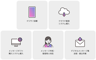 有償メッセージ配信からメッセージテザイン作成、テジタルブック化、クラウド配信までシステム化!最短10分でサイネージヘの反映可能!